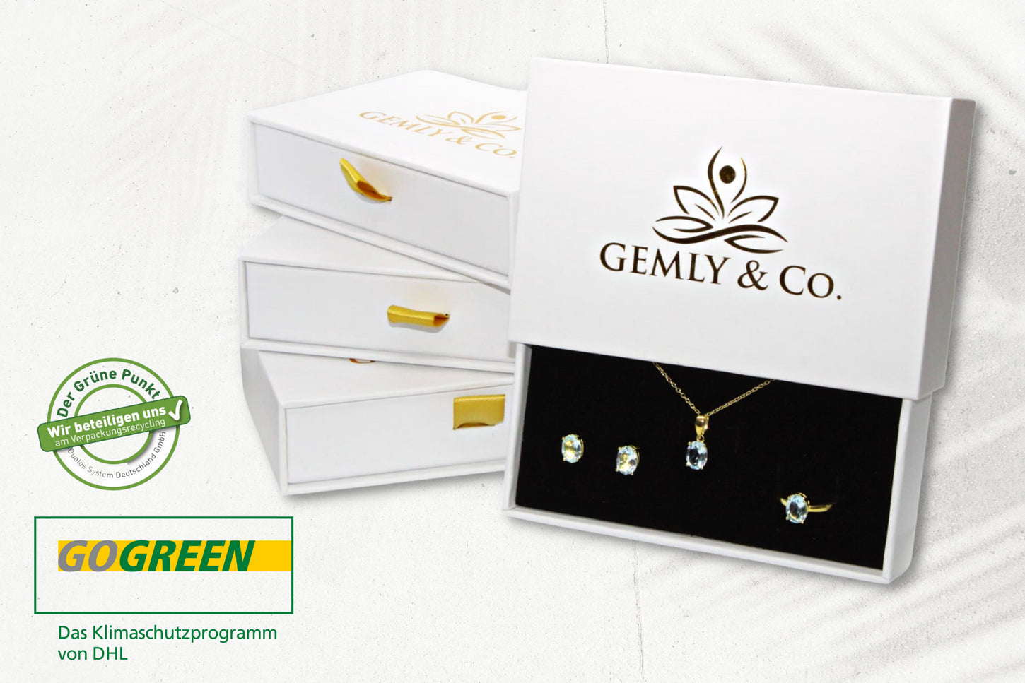 Bei GEMLY & Co. wird Nachhaltigkeit und Ethik großgeschrieben. Denn die Erde ist das Zuhause für uns Menschen, Tiere, Lebewesen, Pflanzen sowie auch den Edelsteinen. Die Schmuckboxen und Versandmaterialien bestehen hierbei aus 100% recyclebaren Materialien lizensiert durch „Der Grüne Punkt". Außerdem versendet GEMLY & Co. alle Pakete innerhalb Deutschlands versandkostenfrei und klimaneutral mit GoGreen der Deutschen Post.