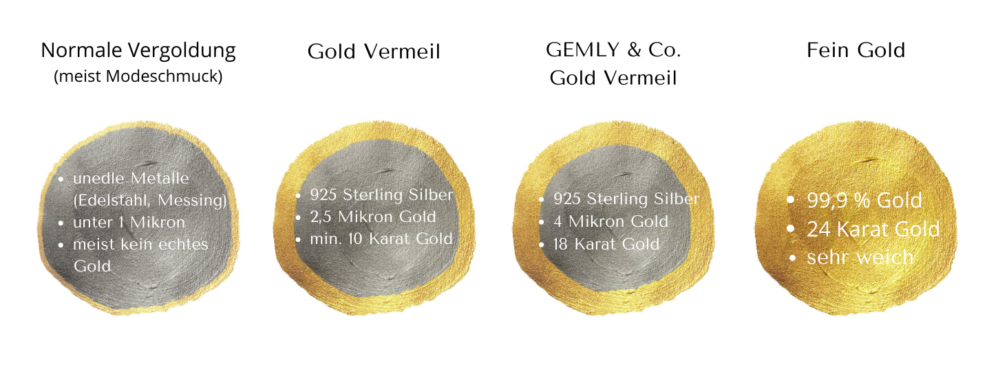 GEMLY & Co. Schmuck kann mit seiner 4 Mikron dicken Goldschicht im Vergleich zu normal vergoldetem Schmuck eine bis zu 5-mal längere Lebensdauer nachweisen und liegt deutlich über den Mindestanforderungen einer Vermeil [ver-may] Vergoldung. Denn die alltagstauglichen minimalistischen Schmuckstücke sollen dich in allen Lebensphasen begleiten, ohne dabei ihre Schönheit zu verlieren. Zusätzlich werden alle Schmuckstücke mit einer Anlaufschutzschicht für langanhaltenden Glanz veredelt. Ich habe mich außerdem für eine 18 Karat Vergoldung entschieden, denn durch seine dicke Goldschicht ähnelt Vermeil optisch stark reinem Gold. Durch den steigenden hohen Goldpreis ist Vermeil Schmuck eine schöne und perfekte Alternative für dich. Diese Besonderheit macht GEMLY & Co. Schmuck durch seine lange Haltbarkeit nicht nur nachhaltiger, sondern auch hochwertiger. Ein großer Vorteil an Vermeil liegt auch darin, dass er hypoallergen ist, da Gold und Silber zwei hochwertige anallergische Edelmetalle sind und er somit unbedenklich für Allergiker ist.